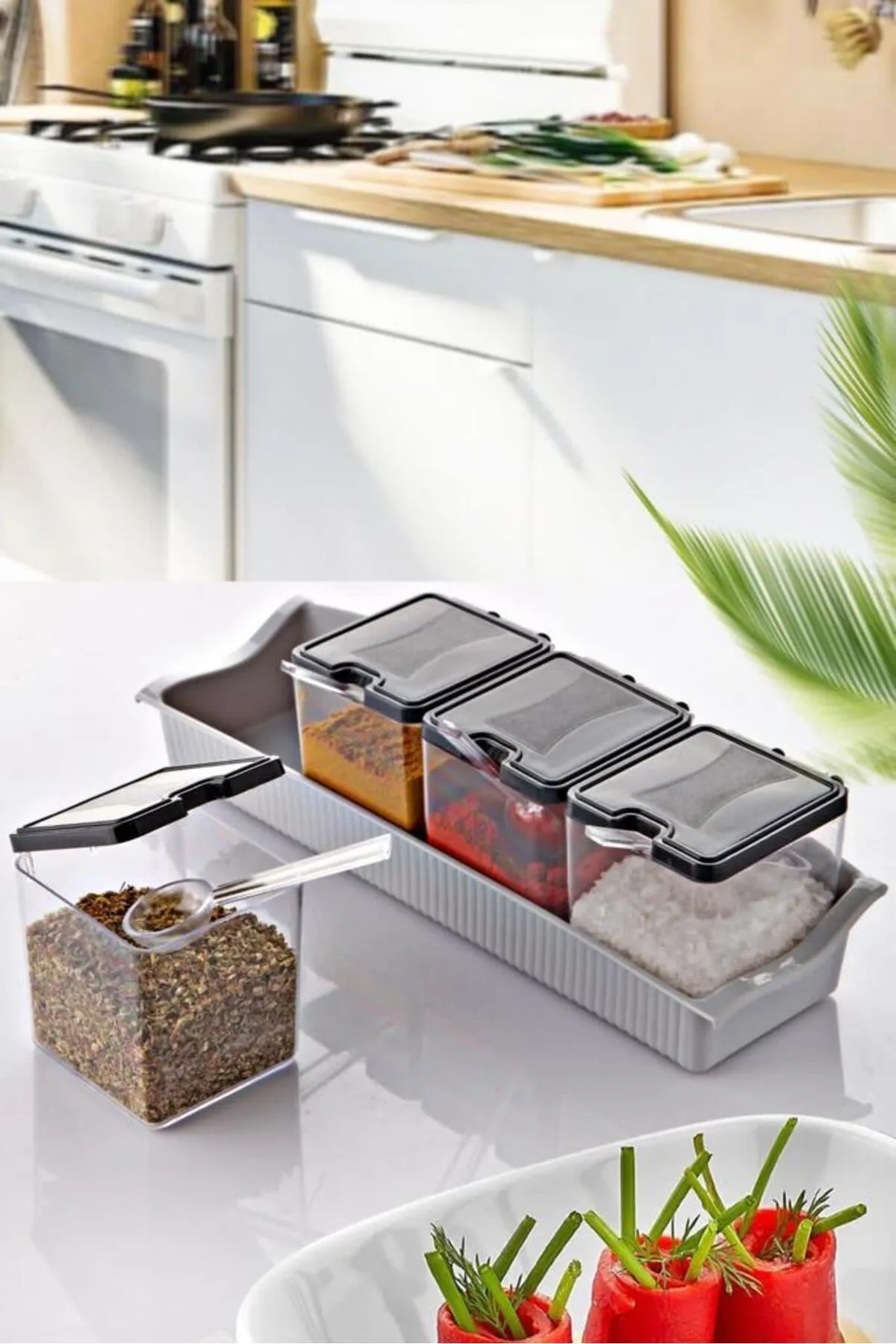 KRC-663 5 PIECE SQUARE SPICE SET WITH STAND provides both practicality and style in your kitchen. This set allows you to store various spices in an organized manner, with a modern design that stands out. Product Code: KRC-663 Product Weight: 110 Gr Product Dimensions: 8x26x7 cm Carton Size: 465x335x200 mm Carton Weight: 2.640 kg Units per Carton: 24 Carton Volume: 0.088 m3